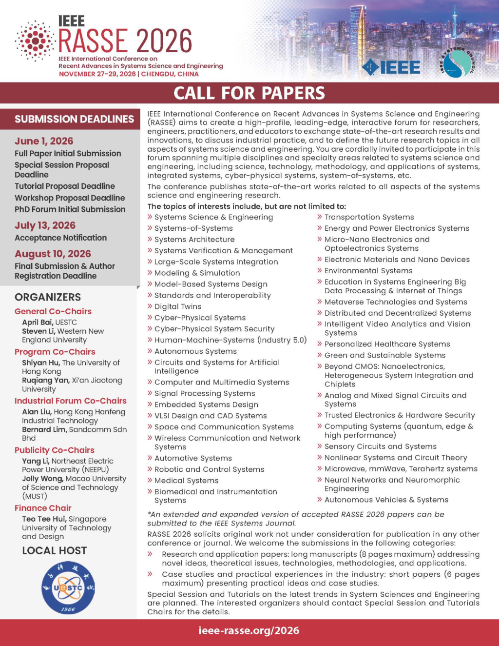 IEEE International Conference on Recent Advances in Systems Science and Engineering (RASSE) aims to create a high-profile, leading-edge, interactive forum for researchers, engineers, practitioners, and educators to exchange state-of-the-art research results and innovations, to discuss industrial practice, and to define the future research topics in all aspects of systems science and engineering. You are cordially invited to participate in this forum spanning multiple disciplines and specialty areas related to systems science and engineering, including science, technology, methodology, and applications of systems, integrated systems, cyber-physical systems, system-of-systems, etc. The conference publishes state-of-the-art works related to all aspects of the systems science and engineering research.