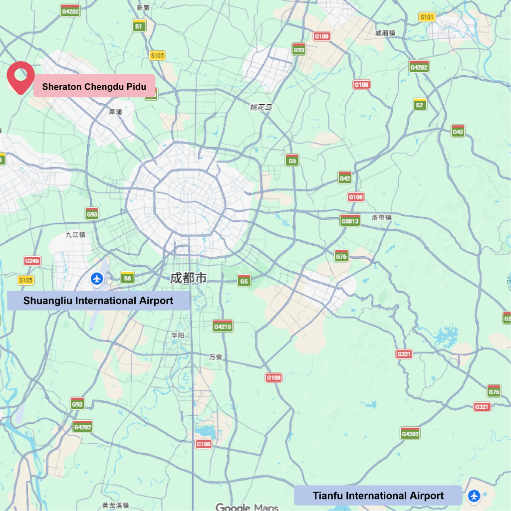 Note: Since Chengdu Tianfu International Airport (TFU) is quite far from the Sheraton Chengdu Pidu, attendees may consider transferring from other cities to land at Chengdu Shuangliu International Airport (CTU) for more convenience.